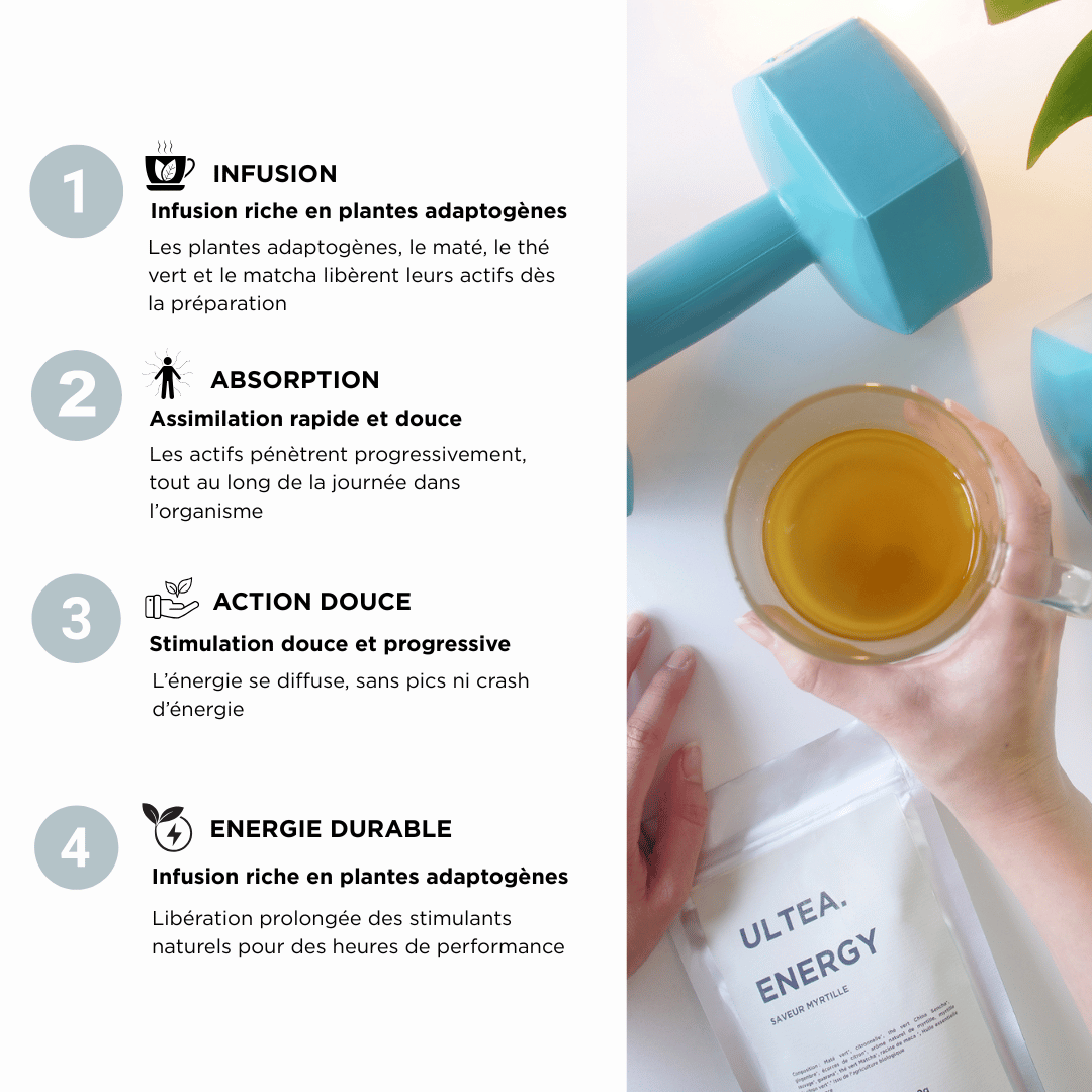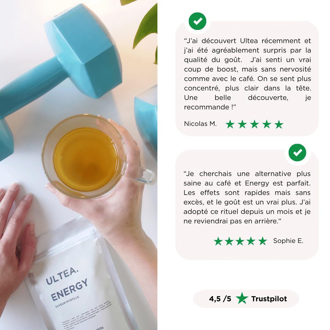Notre assemblage combine maté, matcha, thé vert, guarana et maca pour offrir une énergie durable tout au long de la journée, afin de transformer votre matinée en un véritable rituel de performance.